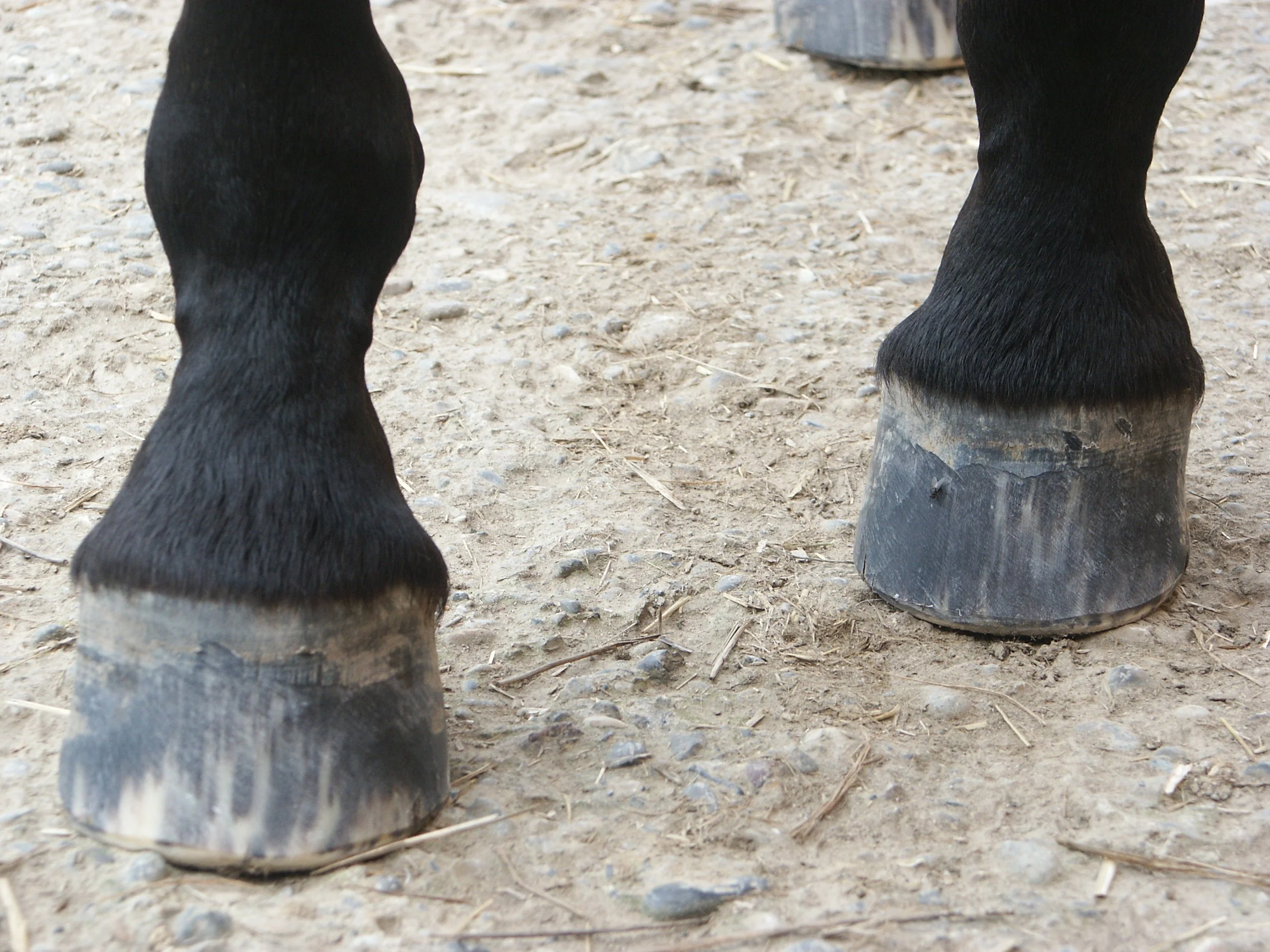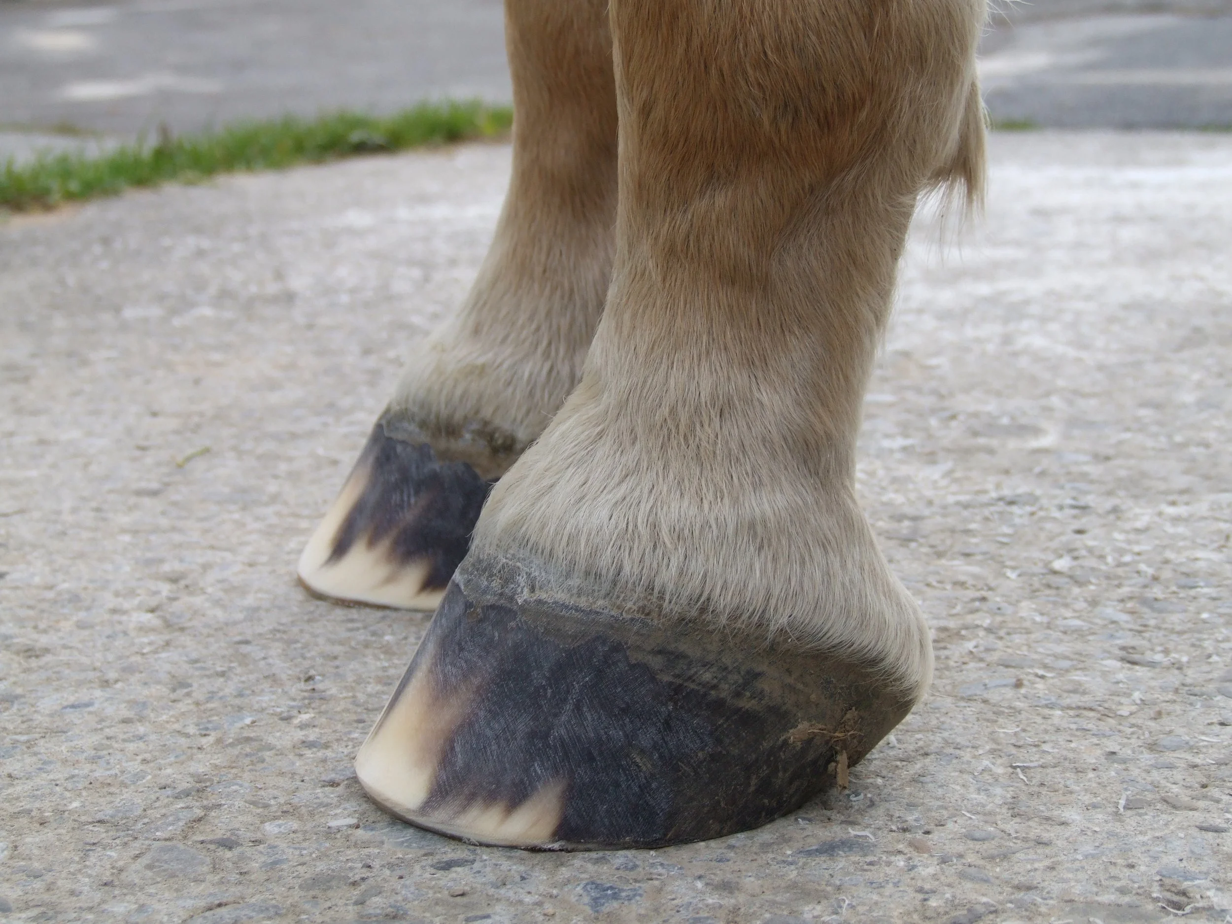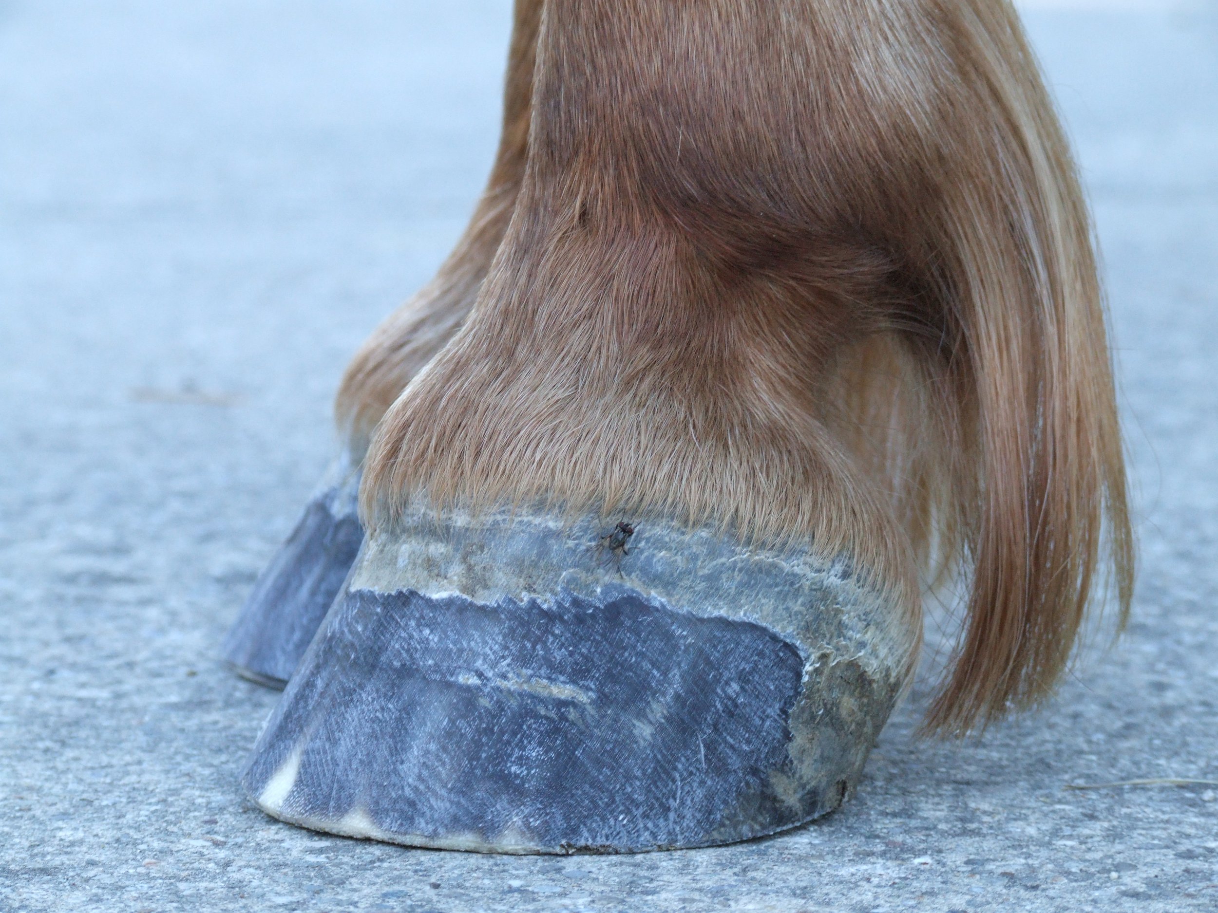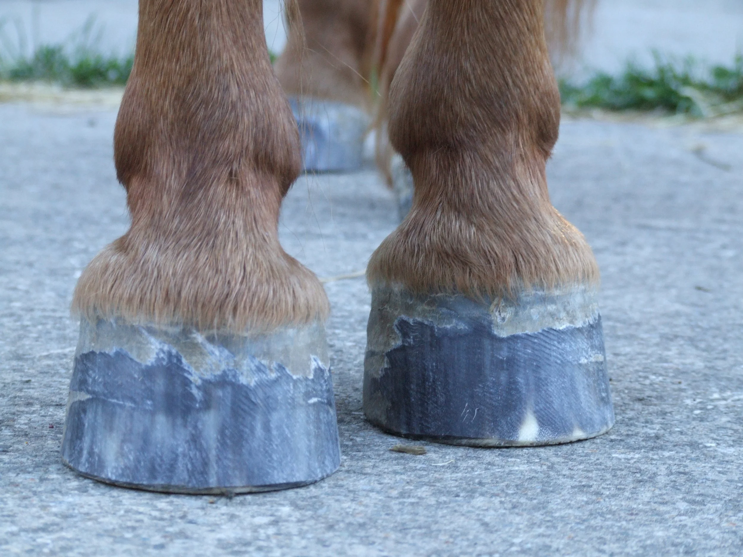 Erweiterte, weisse Linie, nach vorn geschobene Zehe und hohe Trachten, mit den typischen Hufreheringen in der Trachtenwand.